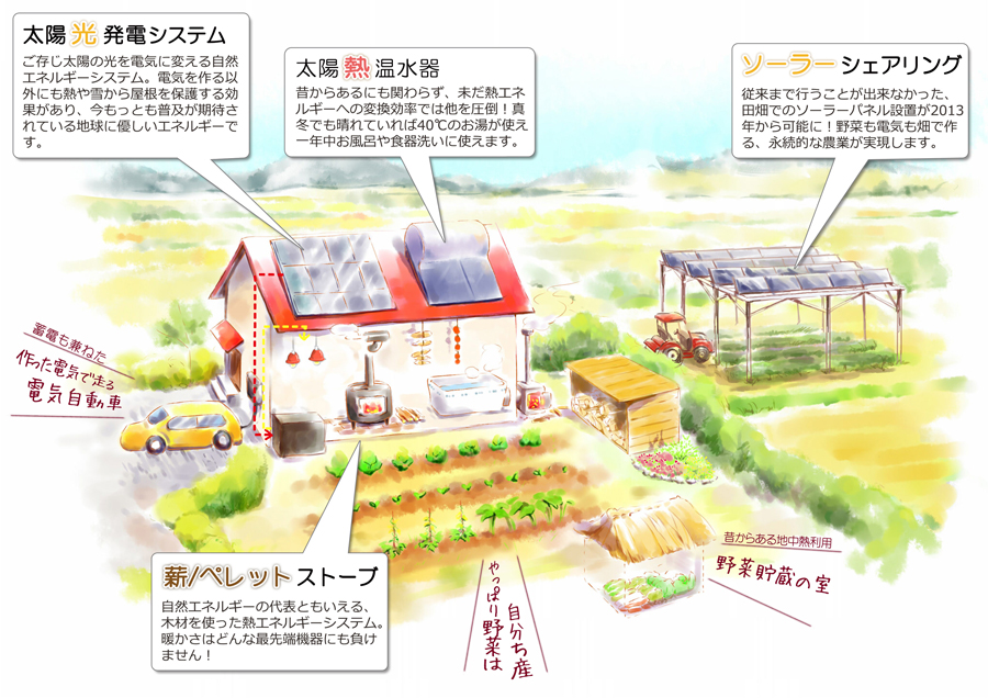 古来より人々は自然の力を上手に暮らしの中に取り入れて生活をしていました。そんな先人たちの知恵を今の暮らしに合うようにアレンジして取り入れた『温故知新』なエネルギーシステムの構築・普及をG&Eかんぱにぃは目指しています。そしていずれは人の暮らしも自然の一部となり、すべてが循環する社会になれば・・・そんな未来を思い描いています。